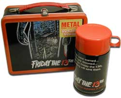 $24.99. This Friday The 13th lunchbox features a "cut-out" torso with blank background showing our five hapless campers in front of their cabin, in the woods. Text underneath reads "Friday The 13th".