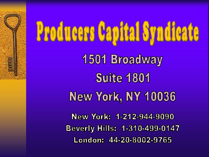 This site and the information contained herein do not constitute an offer or a solicitation of an offer for the purchase or sale of any limited partnership share, interests, or securities. Agreement or offer can be made by prospectus only. In any event, opportunities offered through The Producers Capital Syndicate, a Lang Syne Films, Inc. subsidiary, 1501 Broadway, New York, New York 10036. This site may contain information and press releases about or by The Producers Capital Syndicate and affiliates. While this information was believed to be accurate as of the date prepared, The Producers Capital Syndicate disclaims any duty or obligation to update such information. To the extent that any information is deemed to be a “forward-looking statement” as defined in the rules and regulations under the Securities Act of 1933, as amended, such information is intended to fit within the “safe harbor” for forward-looking information and is subject to material risk factors which may or may not be disclosed herein.