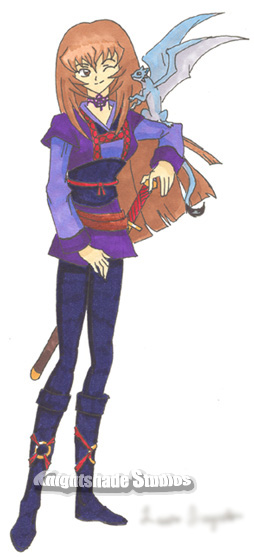 Name: Haidee Iana Daggin Birthday: Begining of the eighth month. Exact date unknown. Element: Earth Zodiac: Leo Height: 5'6" Weight: 130 pounds Eye: Deep Brown Hair: Dark Brown; Layered in front to frame my face. My hair extends down to my mid-back. Favorite Gemstone: Moonstone Favorite Color: Dark Blue Special Features: I have a tatto of a dragon on the back of my right shoulder. I also have a scar across my right cheek I recieved in battle. Skills: I am skilled in many forms of fighting. I was taught to adapt to me surroundings. Weapon of choice, long sword. I have trouble mastering long ranged weapons like the crossbow. Powers: Telekinesis, the power to move objects with ones mind. I can not entirely control my powers with out the stone I wear around my neck. Without the stone I tend to blackout in extreme situations and my power lashes out destroying everything around me. I also have the small power to levitate. Hobbies: I write about creatures I encounter on parchment that is bond together with twine. This is usually kept in a leather pouch tied to my side. Love Life: I always kept to myself until I met Cayos. A highered assasin, a deamon. Even after surviving so many trials I end up losing him. Cayos died leaving me with our child Iana. During my romance with Cayos however I was married to a great lord. Okey I think that about sums it up. What you didn't honestly think I was gonna tell you about myself. There are to many weirdos so there was no way I was gonna give out my personal information. I thought my character information would be a bit more interesting. She is one of the characters from Domain Cerkobeya. It is prenounced Sir - ko - be - ya if you were wondering. Well I hope you enjoyed reading this. Bye bye for now. P.S. Thanks again Yugi, for drawing me. It looks great