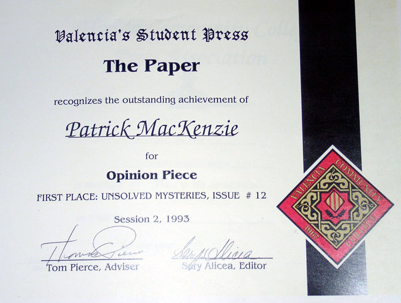 First Place: Opinion Piece (1993) -- Valencia Community College |