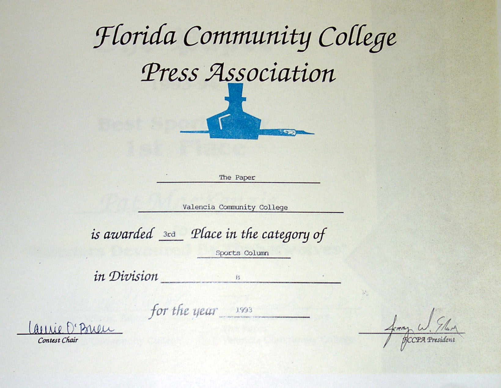 Third Place: Sports Column (1993) -- Florida Community College Press Association |