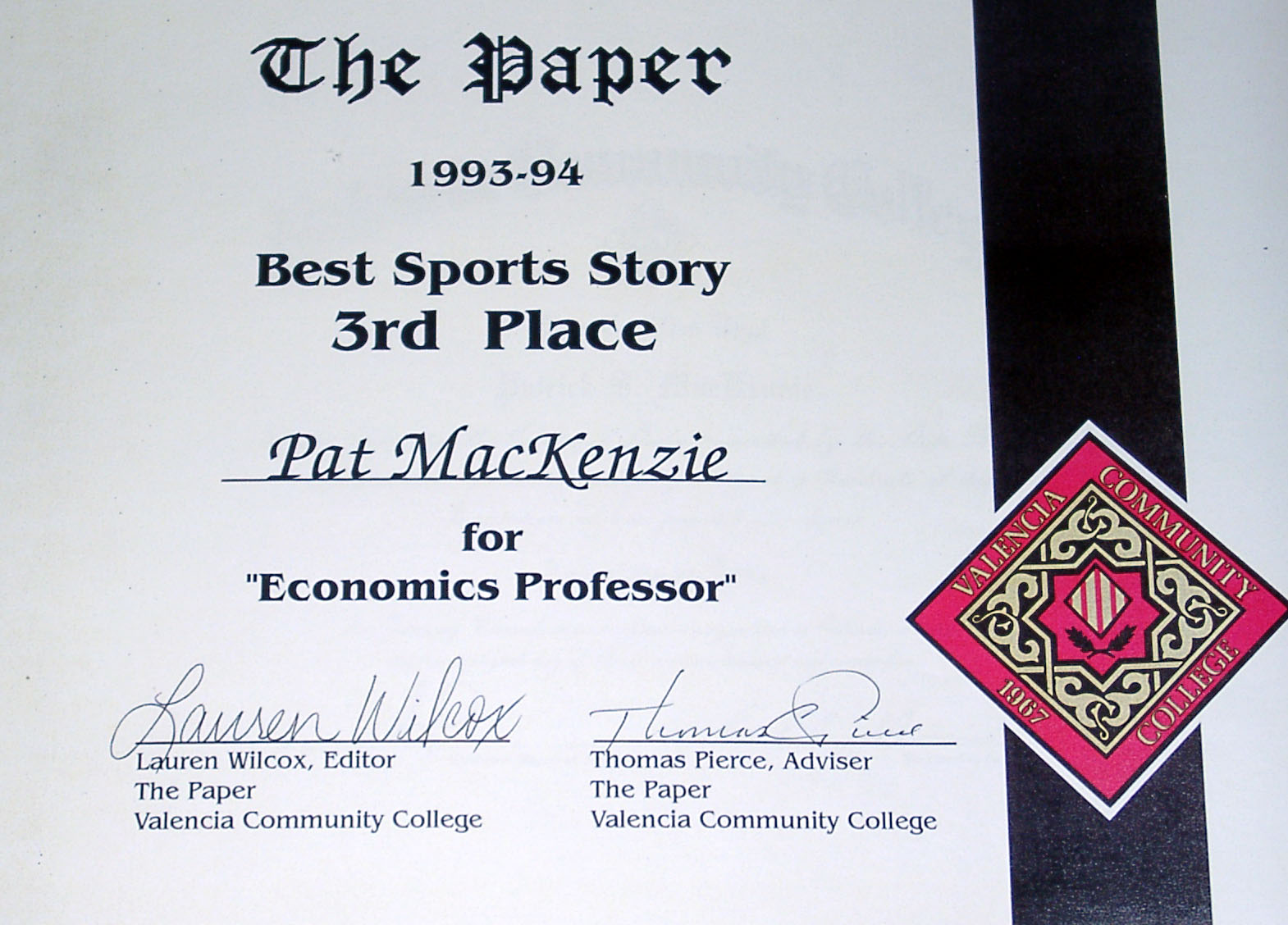 First Place: Best Sports Story (1994) -- Valencia Community College |