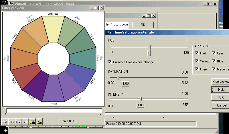 The color wheel BMP opened in VirtualDub with no filter applied: (The left and right images are identical in this top screenshot)