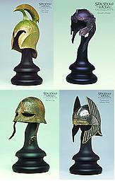 $79.99. From Sideshow/WETA's Lord of The Rings Mini-Helmets, Series 2. These cast metal helms (helmets) are exact 1:4 scale miniatures of the helmets used in "Fellowship of the Ring," the first film in the Lord of the Rings Trilogy. They have been expertly recreated by the same metalsmiths who made the full scale pieces for the films. Each sits on a classically turned pedestal that includes the name of the helm and the sculptor's signature. This set includes: 1x Gimli's Helm, 1x High Elven War Helm, 1x Numenorean Infantry Helm, and 1x Orc Iron Cap. (Subject to change.)