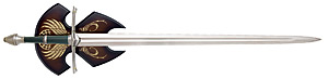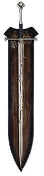 Narsil is perhaps the most famous sword in the "Lord of the Rings" trilogy. At the end of the second age of "Middle-Earth," Narsil's blade was shattered, as Elendil fell during the Last Alliance of Elves and Men in the great battle against Sauron, creating the Shards of Narsil. Isuldur, Elendi's son, then used the broken hilt of Narsil to cut the One Ring from Sauron's finger, breaking the bonds of his power, banishing his evil shadow into the darkness. The Shards were kept in Rivendell, the house of Elrond, for safe keeping. Legend has been told that the sword would one day be reforged and the king would return. Engraved on the pommel are runes in the Elven language of Sindarin that say "Narsil essenya, macil meletya Telchar carneron Navrotesse", which translates to "Narsil is my name, a mighty sword; Telchar made me in Nogrod".
