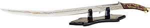 $299.99. Arwen's sword is called Hadhafang which means Throng-cleaver. It once belonged to the Elven princess Idril, who wed a mortal man and bore Earendil, the father of Elrond who in turn was father to Arwen. Before Arwen's birth Elrond wielded Hadhafang at the end of the second age of Middle-Earth, during the Last Alliance of Elves and Men in the great battle against Sauron. Later his daughter Arwen used Hadhafang when she aided Frodo in his escape from the Ringwraiths. Inscribed on the blade are runes in the Elven language of Sindarin that say "aen estar Hadhafang i chathol hen, thand arod dan i thang an i arwen." Which translates to "this blade is called Hadhafang, a noble defense against the enemy throng for a noble lady." The original inscription included the last line "Idril i hel en aran Gond dolen," which translates to "Idril, daughter of the king of the Hidden Rock (Gondolin)." It was dropped from the finished prop due to a lack of space. There is an intentional pun in the inscription - the Sindarin translation of "noble lady" is "arwen", so in effect, the blade claims to be for Arwen, even though it was made for her grandmother.