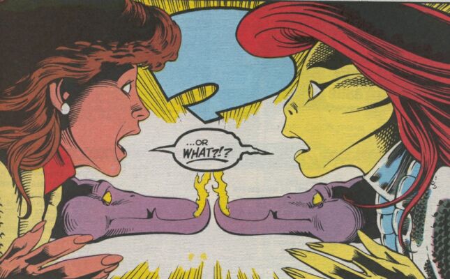 Tom Morgan rendered this encounter between Kitty and her Holocaust alter ego in the graphic novel Excalibur: Weird War Three.