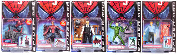 PRICE:$110.99. Toy Biz announces the first series of action figures for the upcoming 2002 movie, Spider-Man. This case of 12 individually packaged action figures includes: 4x Super Poseable Spider-Man with Gargoyle Ledge & Retractable Web Line, 3x Super Poseable Green Goblin with Glider and Base, 1x Norman Osborn with Talking Goblin Mask , 3x Battle Ravaged Spider-Man with Wall Mountable Display Base, and 1x J. Jonah Jameson with Desk Pounding Action. (Subject to change.)