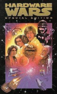 | HARDWARE WARS (1978) "You'll laugh, you'll cry, you'll kiss three bucks goodbye!". A Space-Saga of Romance, Rebellion & Household Appliances. Parody of Star Wars,in the form of a movie preview.Young Fluke Starbucker, under the tutelage of the wise old "red-eye knight". Auggie "Ben" Doggie, learns to master the power of the Force, while teaming up with Ham Salad to rescue Princess Anne-Droid & aid her fight against the evil Empire. A gamut of household appliances appear as vehicles & weapons.Fluke Starbucker drives a dune buggy; Ham Salad,the tough rogue pilots an iron–starship; Princess Anne-Droid has round loaves of bread in place of her side braids.There’s 4-Q-2, resembling a cross between the Tin Man from THE WIZARD OF OZ & an accountant, & Chewchilla,the Wookie Monster.Castor-footed Artie-Deco,is played by a vacuum cleaner!Steam-iron spaceships are suspended by visible wires in front of a mocked-up starfield background,The Death Star is a waffle maker & the x-wings are wine bottle openers.Behind that black-mask helmet,Darph Nader’s every ranting utterance is so muffled that Anne-Droid beseeches him"What? I don't understand you." narrated by Wellesian announcer PAUL FREES.A critical & festival favourite since its release just months after Star Wars, this parody shot in a warehouse went on to become THE highest grossing short film of all time!loaded with "special defects", the standouts are: a re-creation of the "cantina" sequence in a swinging singles bar & a light-saber training scene featuring flashlights! [The venerable AUGIE BEN DOGGIE suddenly clasps his head & swoons...] FLUKE STARBUCKER: "What's the matter,Augie Ben Doggie?Did you feel a great disturbance in the force, as if millions of voices cried out in terror & were suddenly silenced?" AUGIE BEN DOGGIE:"Naw,just a little headache." HARDWARE WARS is gleefully cheesy.Voice-overs, bad acting, & cheap sets make it an instant classic. George Lucas:"Hardware Wars is my favorite Star Wars parody." Awards-:Most Popular Short Film of the Year:Chicago Film Festival.Finalist:Academy AwardTM Nominations.Golden Venus: Miami Film Festival.Golden Eagle:CINE Film Festival.1st Prize:Birmingham Film Festival. 1st Prize:Edinburgh Film Festival.2nd Place:Ann Arbor Film Festival.2nd Place:Concord Sci-Fi Festival Judges' Award.San Francisco Ad Club:Award of Merit,Sinking Creek Film Festival.Blue Ribbon:American Film Festival.WAV snippets:Darph Nader: http://www.tetranet.net/users/brycep/sounds/hw.nadar.wav "You'll never find a more wretched hive of scum and villiany..." : Wr.& Dir. Ernie Fosselius. Prod. Michael Wiese. Phot. John V. Fante & Michael Wiese. Snd. Des. Walt Kraemer. CAST: Fluke Starbucker: Scott Mathews, Augie "Ben" Doggie: Jeff Hale, Princess Anne-Droid: Cindy Furgatch, Ham Salad: Bob Knickerbocker, 4-Q-2: Frank Robertson, Narr: PAUL FREES. 14 mins.CAC. | |