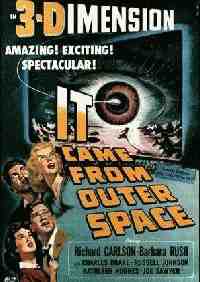 A fun flick even without the 3-D.Based on a story by Ray Bradbury, It Came from Outer Space is surprisingly entertaining. Capitalizing on post-World War II fears of Communist infiltration & remarkable scientific advances of the time,it effectively mixes elements from horror films of the 1930s & 1940s with the intensely xenophobic American mindset of the early Cold War era. Director Jack Arnold occasionally shows the action from the alien point of view, utilizing a weird, watery visual effect that is decidedly scary. He incorporates an eerie soundtrack too, written in part by Henry Mancini, that helps to accentuate the unsettling scenario. With the possible exception of the stereotypically fearful female lead, the actors are also generally credible. The original theatrical release featured 3-D effects. It's easy to see where these shots would have added a bit of fun (a backyard telescope jutting up to the sky, the thundering avalanche that engulfs the spaceship, etc.), yet the action remains consistently intriguing, inarguably an intelligent & enjoyable adventure. RUSSELL (GILLIGAN'S ISLAND) JOHNSON, JOE (RIN TIN TIN) SAWYER. |