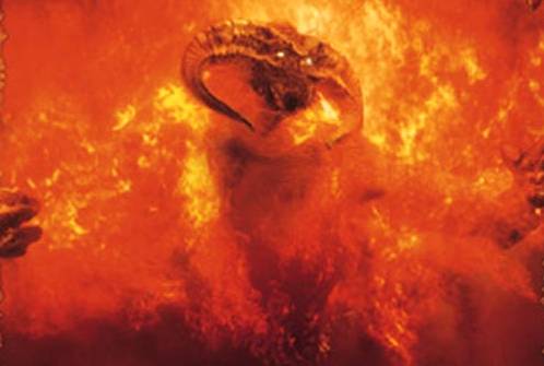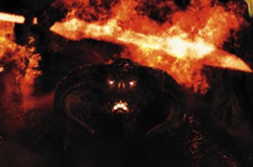 It’s size and fire are its visual tour de force but it also relies on buidup. It signals its coming with a drumbeat, stepping rhythmically our way as a herald of its coming. This is devilry. Evil loves its performance. The grand entrance of the Balrog is apre a fiery pre show where shadow and flame mix in a gruesome prologue. Then, announcements over, in comes the big show. Full display. We are going down. We wonder how to tackle a Balrog. Its notoriety precedes it and the prepublicity speaks of short odds. The creature has set the agenda, chosen the battleground and looks up for a fight. If we take the terms of battle offered we would surely be destroyed. Our first defence is the realisation that this creature is also a Guardian. It Guards a threshold and if we could get close enough we could cast it back there or discover the secret all this theatre is meant to distract us from. The Balrog wants to project its weapons at a distance, fiery plumes, fiery sword and whip can cut us down. We must transform this battle into an ordeal. Gandalf achieves this by standing ground. The encounter is therefore modified into an ordeal which has the possibility if not of victory then of some form of transformation. Confronted with steadfastness our Balrog has lost round one. Mutterings from Gandalf about secret flames and the waving staff have distracted it. It has not terrorised us and we seem to have some sort of open ended strategy. Our drumbeat is aryhtmical and disrupting. This will confuse the monodirectional Balrog.