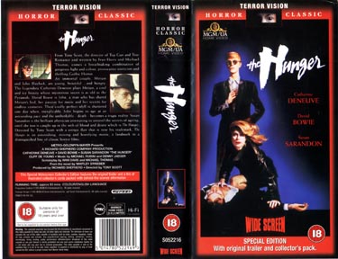When The Hunger was released as part of the Terror Vision range of horror classics, it made its widescreen debut. The tape also featured the theatrical trailer and a set of three collectors' cards with credits and info.