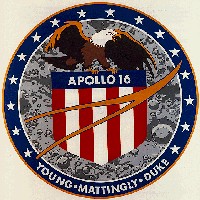 Basically the design was a brown and white eagle with wings outstreched, perched atop a red, white, and blue American seal, over a gray lunar surface background. To show teamwork, the yellow NASA wishbone symbol of flight was placed on top of the seal, and then across the seal were written the words Apollo-16. Circling a blue and gold border were our names - YOUNG, MATTINGLY, and DUKE - and sixteen white stars to emphasize outher space and the number of our flight. We were very proud of this patch, wich to us symbolized Apollo-16"...