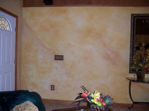 Aged Mediterranean "Faux" Beautiful aged golden color wraps the walls giving this room a completely different feel! Complete with a few aged "cracks" in the walls. This look was awesome with my clients "Tommy Bahama" stlye decor. Aged Mediterranean "Faux" (#2) 2nd wall w/ crack. I love the way it compliments her vintage clock.