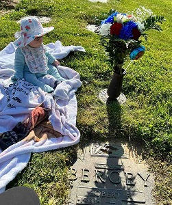 Preslee is a happy baby. Monica took her to the cemetery to "introduce" her to Poppa B. She took this picture of Preslee at the cemetery.