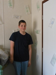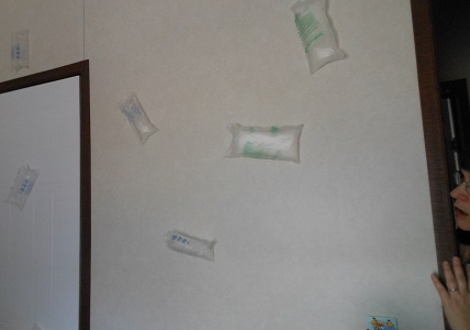 While Grandma was out of the room, Dwight decided to decorate the walls in her office in a unique way, using packing materials he had found in some boxes.