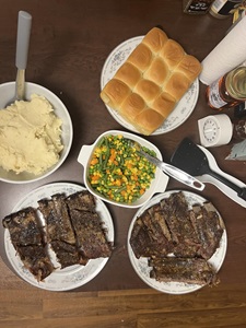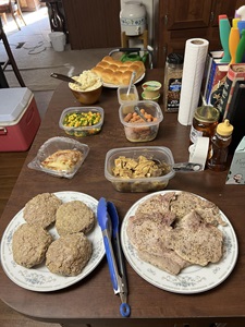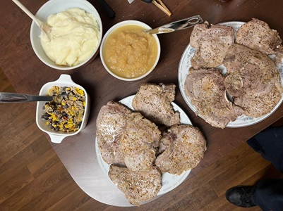simply pork chops and Applesauce. Added some Southwest protein beans and veggies, with my standard mashed potatoes as another side. |