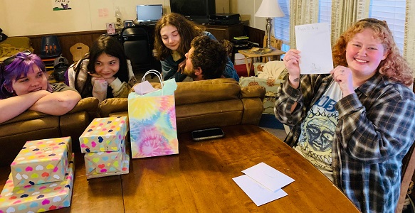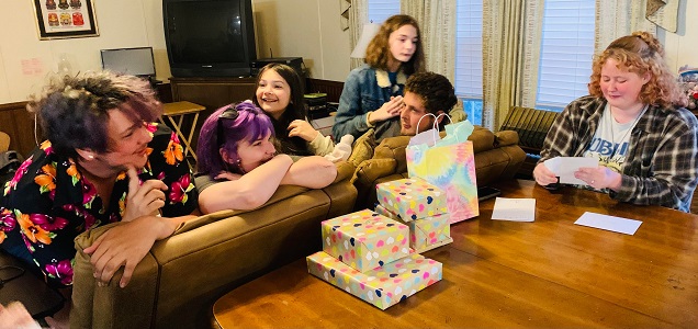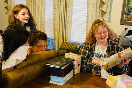 The kids were cutely sitting together like “birds on a wire,” watching the present opening.