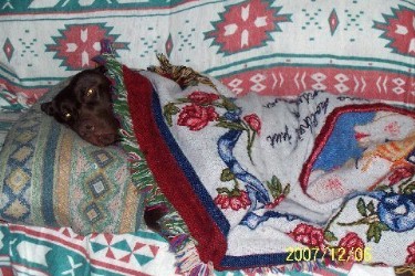 Bella decided it wasn't fit for man or beast outside. She grabbed Mike's pillow and curls up on her blankie. She then tried to "cover up" with the sofa blanket, so Melanie helped and tucked her in.