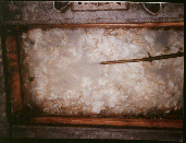 Stage 4: About thirty minutes before I had filled the trough with a mixture of water and stale urine and I was ready to start getting more dirt out of the fleece (plate 14). When the stones were heated I began to place them into the water being careful not to drop them. My father had constructed a very simple device that allowed me to lift the stones from the hearth into the trough (plate 15 & 16). It basically consisted of two long pieces of wood which were rounded at the end-allowing me to pick up any stone. I placed twelve stones into the trough in quick succession. Only one stone shattered when it hit the water the rest remaining intact. Loud hissing noises were heard whenever a stone was placed into the water. When all the twelve stones were placed in the trough a bubbling/hissing noise could be heard as the water circulated around the trough. Steam started to billow out of the trough as the water heated further (plate 17). When the water reached boiling point a white froth developed on the surface, this was the detergent going into action (plate 18). I placed the fleece into the trough and immersed it into the water (plate 19). I let the water boil for a short while and then I stared to place some other hot stones into the trough at the rate of one every ten minutes. As I only wanted to boil the fleece for a short time, only three more rocks were placed into the trough.