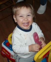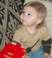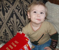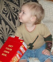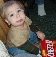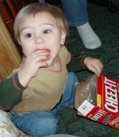 Boyd and Dwight came to see Aunt Ellie and they wanted a snack when they were there. Boyd dug his little handies into the box of Cheese-Its while Dwight wanted some fruit roll-ups. Then Adam came over and Boyd was fascinated, watching him...but he's not letting go of that box of Cheese-Its...