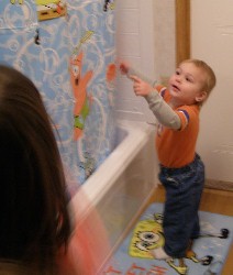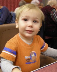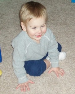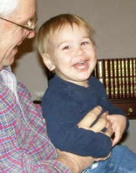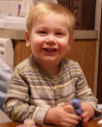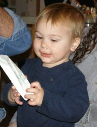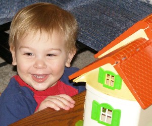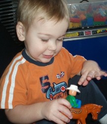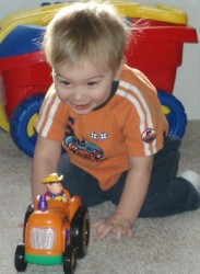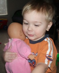 Boyd loved the baby doll and carried it around with him everywhere, even while playing with tractors and cars. He finally put the baby down and went to play with some other toys, chatting away the whole time...