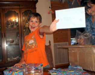 Boyd has been asking me periodically for weeks if I can get some more buttermints, like the ones we brought home from Nicole's wedding. We hunted all over for them this past weekend and finally found some that even had "happy birthday" wrappers on them. When Boyd opened them (in this first picture) he was underwhelmed, lol.