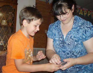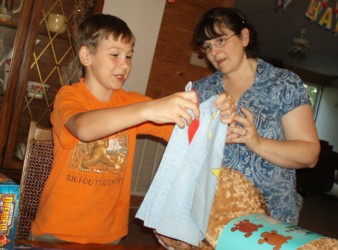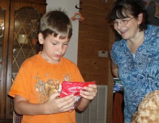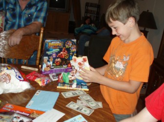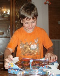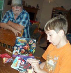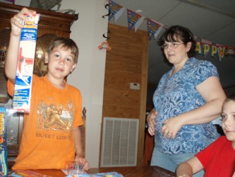Next he opened up the presents from his Mom and Dad - his longed-for ipod touch, with accessories. It was hard for him to open up the rest of the presents after that, he just wanted to play with his ipod. Dwight wasn't jealous now that both Bishy and Boyd have ipods. He's very excited because now "the computer is all mine!" he said. One of the very first things Boyd did was play "Minecraft" on his ipod, I think that is the main reason he wanted it. But he still wants an x-box too. Bishy told him that he might be able to find a good deal on one with his birthday money at The Game Stop.