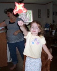 She loved the decorations (a gift that keeps on giving, thank you Laurie!) and was very upset when Mr. Klutzy pulled down part of one of the dangly bits and broke it. He hung it back up there, which didn't quite satisfy her, but Becky and I both assured her it was fine, and she finally stopped worrying about it.