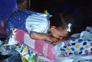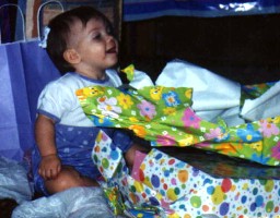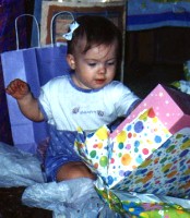 Opening her baby doll. |
