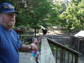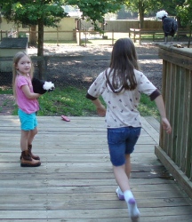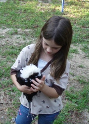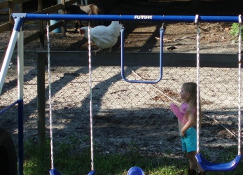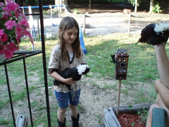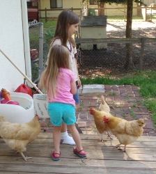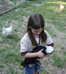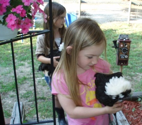 Brooke gave one of the fuzzy headed chickens to Ashlyn so she can "show" at the fair. Brooke put a little "scratch" on the ground for the chickens. You should have seen them come running when they heard her shake the container! It was so funny, the way they got so excited and raced over to Brooke.