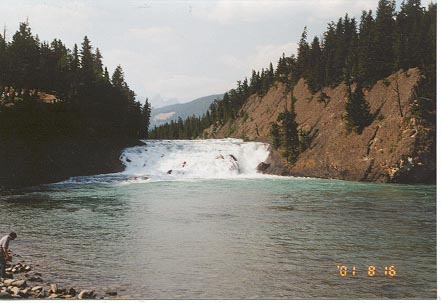 From Canmore, we went to Jasper National Park where we took a snowcoach tour of the Athabasca Glacier of Columbia Icefield. The Athabasca Glacier is a gentle, six kilometre tongue of ice flowing from the Columbia Icefield. Icefields are formed by compacting snow. The surface ice is hard and breaks easily but under the surface, the ice is more liquid and flows easily. Along the way, we view the Crow Foot Glacier, the Bow Lake, and other wonderful sceneries. Below is a picture of Bow Falls.