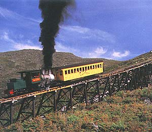 Day Fourteen - July 23rd: We left Bangor for Mount Washington. We drove to the top of the Mountain and it was great ! We had a great time worrying about falling off the edge of the road because it doesn't have any guard rail. The road uphill was 7.6 miles or 12.23 kilometers. At the summit it was 6,288 feet or 1916.58 meters. The highest wind recorded at the summit was 231 mph or 372 kph ! It offers a spectacular view at the top though. We also saw "the little engine that could" ! It is the Mount Washington Cog Railway. It is a coal-fired steam train.