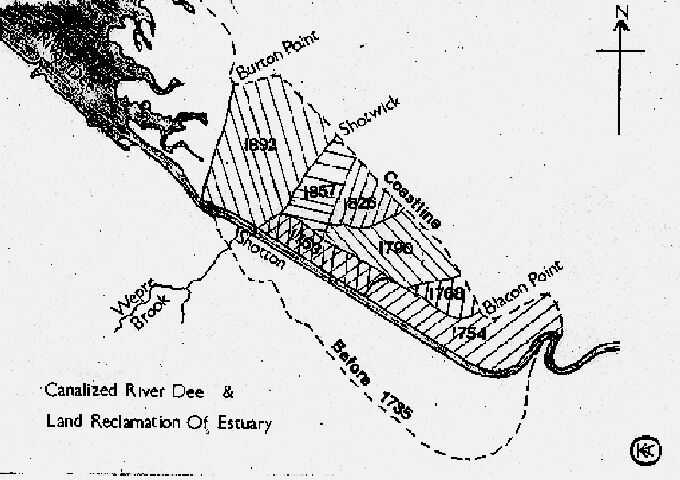 Further suggestions for canalising the River Dee were proposed in subsequent years, but the scheme which finally won approval was the proposal by Nathaniel Kinderley in 1732. Between 1735 - 6 Nathaniel Kinderley & Company cut a new channel on the Welsh side of the existing river from Chester to Golftyn. The new Dee channel was opened to shipping in 1737. In 1740 Kinderley's company became known as the River Dee Company. It seems that they neglected their duty to maintain the channel, allowing it to silt up again. Instead they turned their attention to the thousands of acres of reclaimed marshlands around Sealand and Saltney which, by the year 1861 was raising £8000 in annual rent.