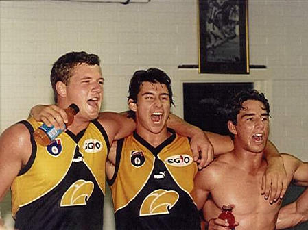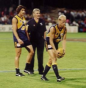 Andrew talks to coach Mick Malthouse, while Dean Kemp lines up for goal!!