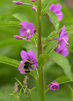 Pick, wash and measure 8 cups of fireweed blossoms. Add 1/4 cup lemon juice and 4 1/2 cups water. Boil 10 minutes and strain. Take the strained juice and heat to lukewarm. Add 2 pkgs powdered pectin and bring to boil. Add 5 cups sugar and bring to full boil. Boil hard for 1 minute. Pour into hot clean jars and seal. Process in boiling water bath for 10 minutes.