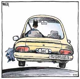 I was not totally opposed. In my youth I read many Batman comics, and it seemed to me that he had a pretty neat life, disguised as wealthy playboy Bruce Wayne, waiting for the police commissioner of Gotham City to shine the Bat Signal onto the clouds (it was always a cloudy night when the commissioner needed Batman). Then Bruce would change instantly -- it took him only one comic-book panel -- into his Batman costume and roar off in the Batmobile to do battle with the Forces of Evil or attend a birthday party.