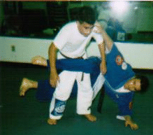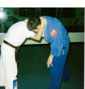 It makes it easier to complete this takedown if you pull on the back of your opponents neck so that he will pull back and set up your takedown.