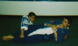 Now throw your right leg across the front of his hip and your left behind his knee. Make sure you jump into this position because if your legs are too low you can hurt your opponent's knees.