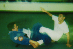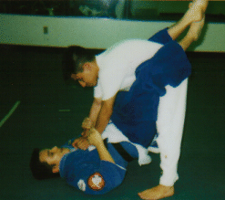 Grab his ankles and put your legs on his knees. Push back with your legs and pull his ankles in. This should make him fall and give you a chance to mount.