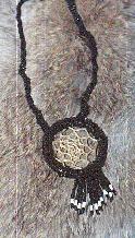 RED DEER BONE AND BLACK BUFFALO HORN HAIRPIPE BEADS WITH BRASS ROUNDS AND GENUINE ABALONE DISK, MAKE UP THIS UNIQUE STYLE CHOKER. IT IS STRUNG WITH ARTIFICIAL SENEW AND MOUNTED ON HAND CUT BUCKSKIN. THIS IMPRESSIVE PIECE WILL BE A VERY INTRIGUING ADDITION TO ANY REGALA. ALSO AVAILABLE IN, ALL WHITE, ALL BLACK, ALL RED, RED AND WHITE AND BLACK AND WHITE. THE CHOICE IS YOURS.