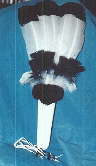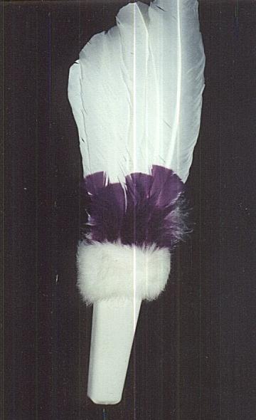 This fan is made of five white turkey feathers in a slant wing design. It is finished at the handle with purple and white fluffs and white rabbit fur to set off the beautiful purple feathers. The handle is covered in white doe skin and laced in the back with a herringbone stitch in white jewelers lace. This very delicate design can be yours for only $45.00