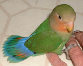 "Kiwi" Holding on to Mom & showing off pretty tail feathers