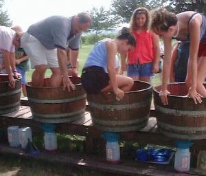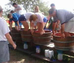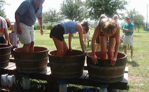 Teri & Lauren having fun stomping grapes, (Kathie far left)