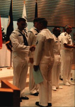 (right) Joe accepting his Grad certificate and Orders for Duty Station.