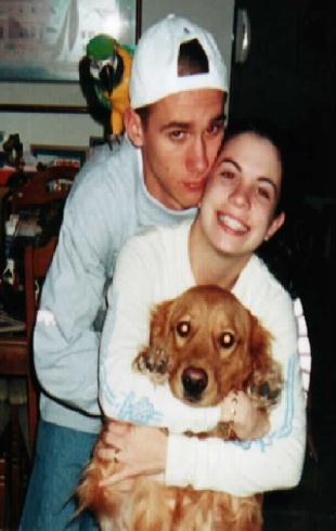 (left)Kemp Family Picture~ Chris, Teri, Coco(B/G Macaw)& Alexis(Golden Retriever).