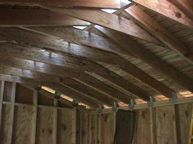 The roof framing is stick built with 2X6s on 16" centers. The front and back wall height is only about 90 inches but allows a full height door under the 4X6 header. The head room under the collar ties is about 8 ½ feet. The roof decking is 4" T1-11 pressure treated siding with the grooved side down (it gives a finished look to the interior). The rafters are fastened down with H10 Hurricane connectors. Notice in the far corner the tow ½ inch bolts that run from the concrete pier thru the top plate where the nuts sit on a 3X3 steel plate to hold the whole thing down. There are a total of ten of these holding the building down.