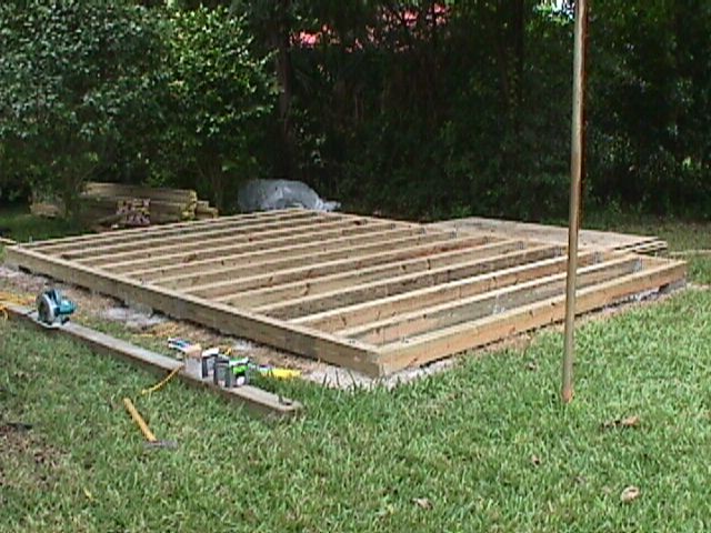 Anatomy of a Storage Shed. It started with the concrete piers – hand mixed 40 bags of Sackrete (80#). There are six piers, the corners ones have two bolts and the one in the middle of the front and back have one bolt. The floor system is made of 4X6 pressure treated (ground contact) pine. We put some lattice around inside the outer band to keep critters from getting under there, because it is a few inches off the ground. Floor joist are hung with HUS46 joist hangers.