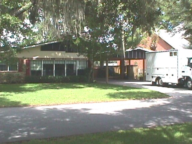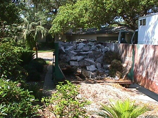 After getting the power line (and phone and cable lines underground, we needed to do something with the palm tree. The home owner finally found somebody that would do that -- they had to hand dig the root out and then get a crane to lay it down and move it. It only moved about 15 feet but that got it out from in front where the widened carport would go. After that, the next thing was to get the driveway widened and the new porch concrete poured. The concrete guy was supposed to do the preperation but he was backed up. I finally borrowed an electric jackhammer and tore out the old sidewalk and did all the digging and built the forms. THEN, the concrete guys came and poured the concrete. This picture shows how I overloaded the 10 yd dumpster with broken concrete. When the truck came to haul it away, I thought I would have to off load part of it. He finally got it up but the front wheels of the truck came about three feet off the ground before it finally lifted.