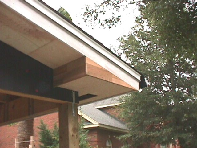 With the roof dried in (actually the shingles should have been on but I didn't know that) I got the dry in inspection. I had to talk fast to get the front beam of the carport passed -- I managed to find four sources that confirmed (and agreed) that the double 2X12 was capable of carrying the 1880 pound load that is on it. After that hurdle, and a weekend spent researching and worrying, we can get into the trim work on the project. This picture shows the "Pretty Box" that we devised for the corner of the eave. You can see that it wraps the soffet around the corner. It was fairly complex to build but has a really simple look to it. I think it turned out well.